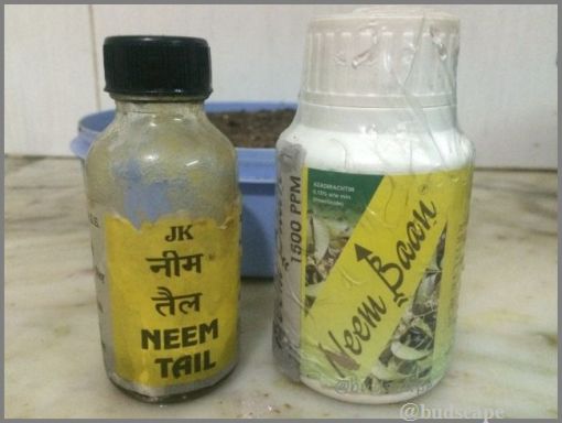 Neem is a magical plant available in the form of powdered leaves, neem cake and oil for uses in the garden. It is available in small bottles from shops stocking agricultural products, pesticides, ayurvedic medicines and of-course, online at FLIPKART, AMAZON, SNAPDEAL etc.