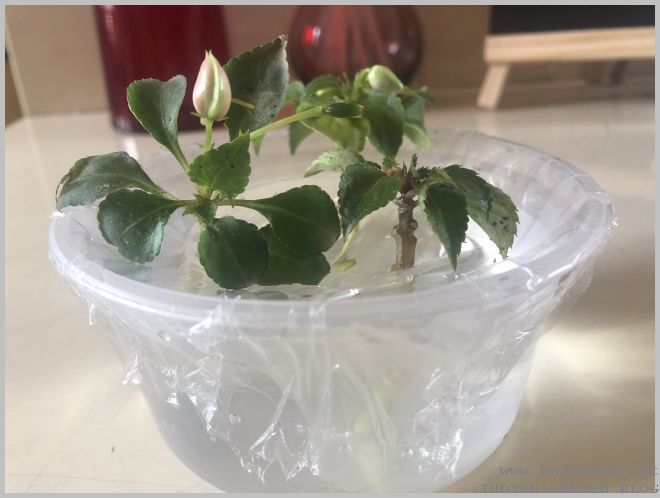 3. Cover it with cling wrap. This helps the Impatiens cuttings to float easily and keep the stems emerged in water.