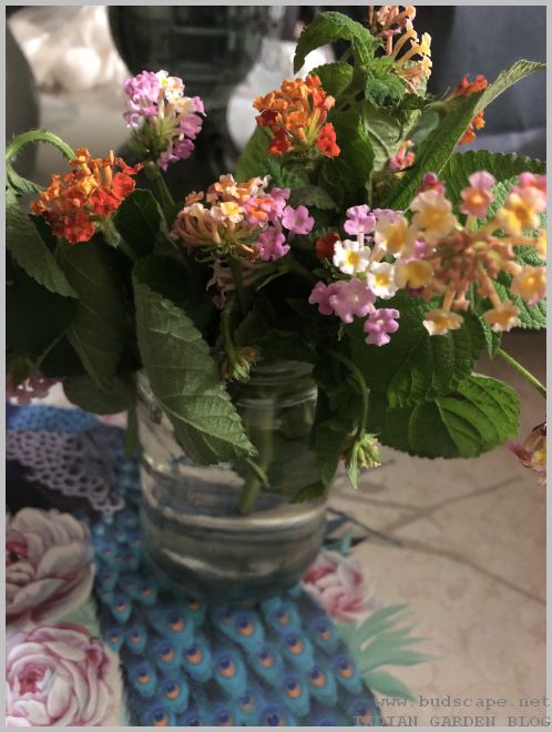 The first batch of lantana cuttings looked like this. Since they had started drying by the time we were home, I just put them overnight in a jar of water to perk them up. This trick always works very well to revive most plant cuttings.