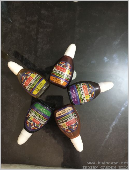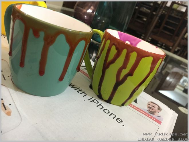 Since the cups were plain, I decided to add some glamour with my stash of VERY old glass paints (that still surprisingly were liquid). Also, I do not know how to drill holes in ceramic, yet, so the good old trick of using gravel works well.