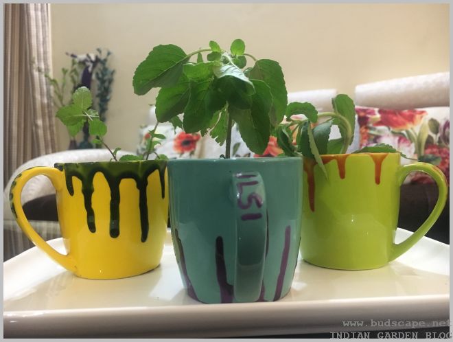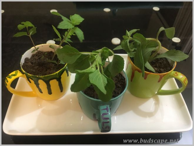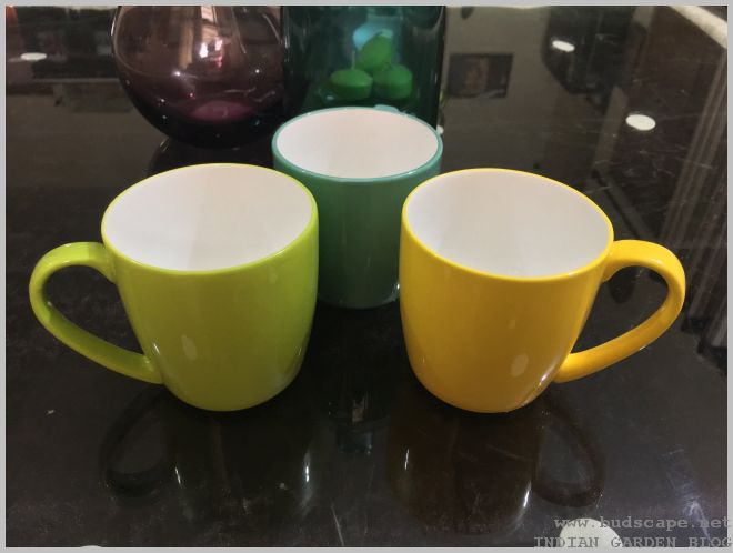 So, while browsing my favorite home store (Homecentre by Lifestyle), I spotted these ceramic tea cups for Rs. 49 each. Perfect for growing herbs indoors and matching our drawing room, I thought!