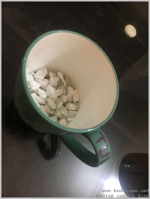 Since there is no drainage hole in these cups and i can control the watering indoors, i only layered some gravel at the bottom to keep the soil dry.