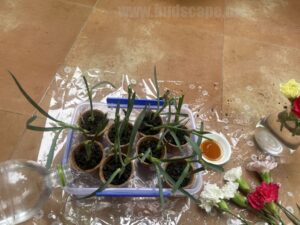 Soil texture is very important while rooting carnation stems. It should be well draining and not hold water otherwise cuttings can rot. Use a readymade potting mix, vermicompost or sandy soil to root cuttings.
